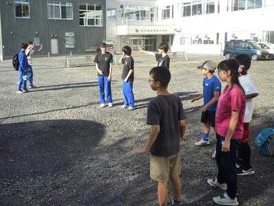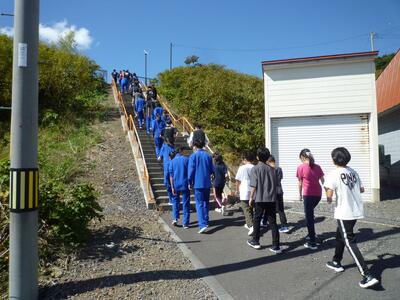 今日から小中合同の「朝のあいさつ運動」が始まりました。シェルター(階段)の前にならび、登校する児童・生徒に元気よくあいさつをおこないました。
