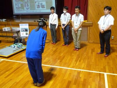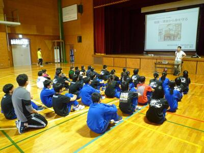 1日防災学校では、稚内地方気象台から4名の講師を派遣して頂き、地震と津波について学習をおこないました。特に授業の最後に「地震体験装置」で震度7の揺れを体験しました。