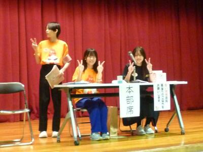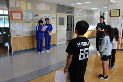 10月8日(水)の昼休みを活用して、生徒会の代表が香深井小学校へ香中祭のPRに行って来ました。お祭り広場で使用できる遊び券を配布し、ポスターの掲示を依頼してきました。