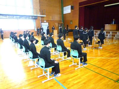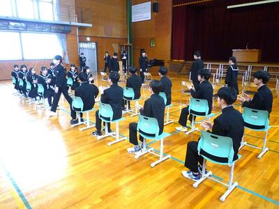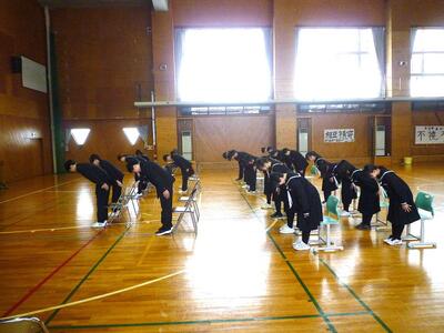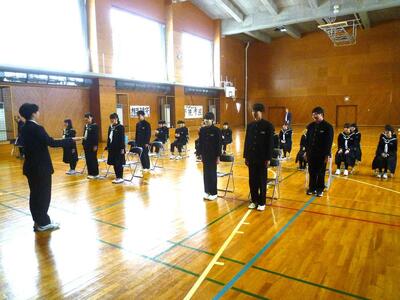 卒業生の入場から退場まで、流れを確認し、礼の仕方や立ち方、座り方、移動の仕方、並び方などを確認しました。