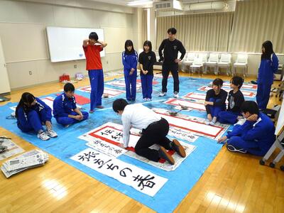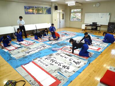 3年生は、書写(国語)の授業で画仙紙に「旅立ちの春」または「伝統を守る」を行書で書く練習をしました。普段、なかなか筆・墨で大きな文字を書くことはないと思いますが、みんな上手に書いていました。