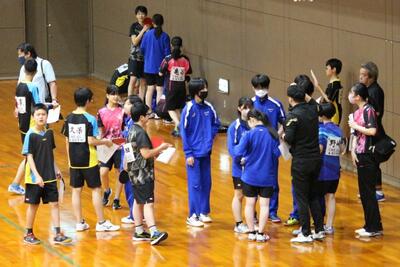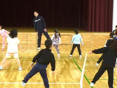 低学年では、身体を左右にゆらしながら腕を振る練習、紙鉄砲(今の子どもたちは遊んだことが無かったらしい…)を使って遊びながらリリースポイントを確認する練習、そして最後はゲームをして身体を動かしました。低学年の児童が夢中になって授業に取組んでいました。