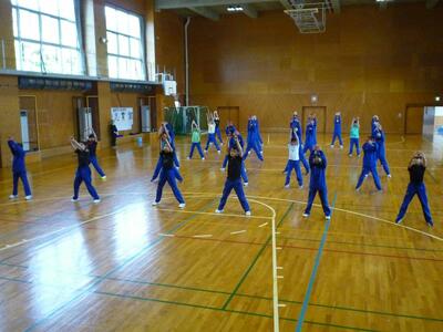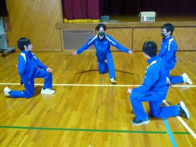 今日は全学年合同体育で2・3年生が1年生に「香中ソーラン」を教えました。男女別の3~4人のグループに分かれて上級生が優しく1年生に踊りの指導をしました。