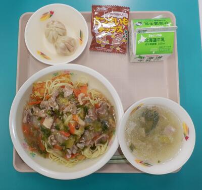 牛乳、あんかけ焼きそば、ショーロンポー、チンゲン菜のスープ、さつまいもチップス