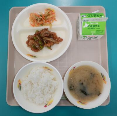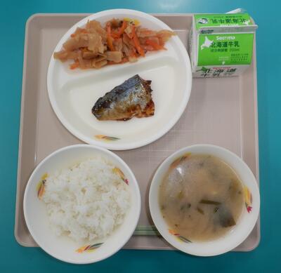 牛乳、ごはん、さばのしょうが煮、たけのこのきんぴら、かみなり汁