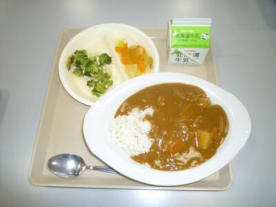 牛乳、ポークカレー(麦ごはん)、ブロッコリーとチーズのサラダ、フルーツゼリーあえ