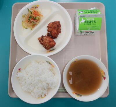 牛乳、ごはん、チキンチキンごぼう、切り干し大根のピリ辛あえ、じゃがいもとほうれん草のみそ汁