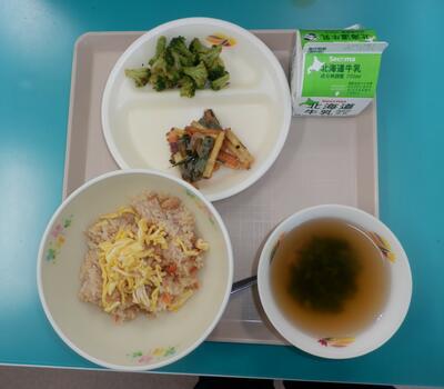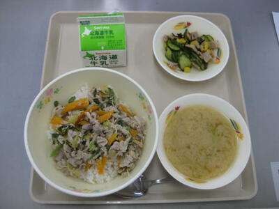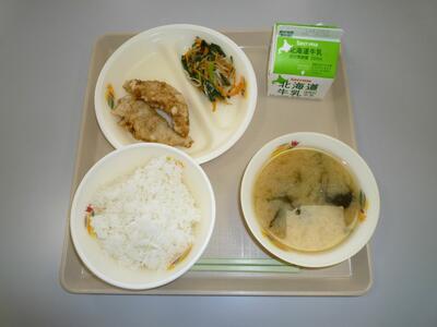 牛乳,ごはん,鶏塩ザンギ,切干大根の中華あえ,ユッケジャン風スープ