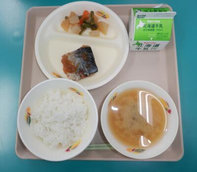 牛乳,ごはん,さばのみぞれ煮,大根とこんにゃくの炒め煮,じゃがいもとわかめのみそ汁