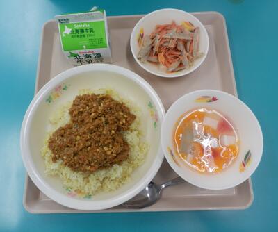 牛乳,ドライカレー(麦ごはん),ごぼうサラダ,シュワシュワフルーツポンチ