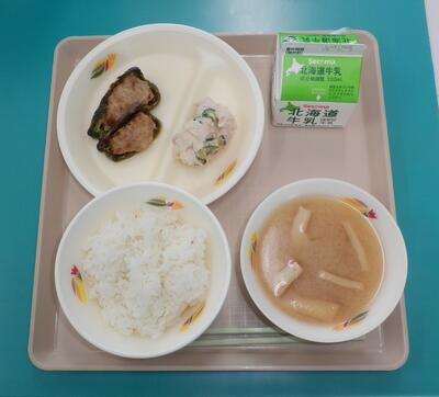 牛乳,ごはん,ピーマンの肉詰め,ツナポテサラダ,大根と油揚げのみそ汁
