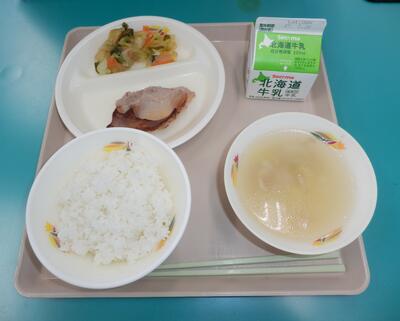 牛乳,ごはん,あじフライ,キャベツのごま炒め,豆腐と小松菜のみそ汁