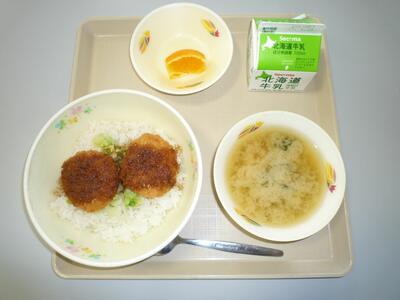 牛乳、チキンカツ丼、(麦ごはん)、豆腐とほうれん草のみそ汁
