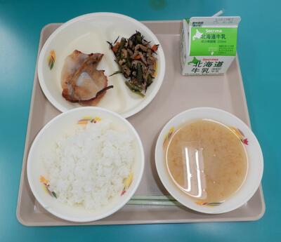 牛乳,ごはん,豚のみそ漬け焼き,ひじきの炒め煮,白菜とえのきのみそ汁