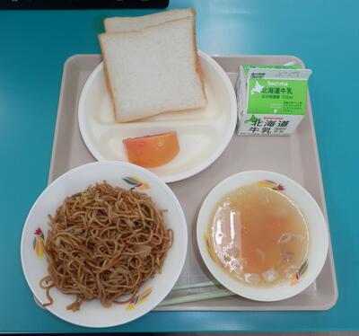 牛乳,焼きそばパン,ペイザンヌスープ,グレープフルーツ