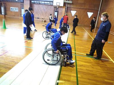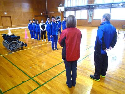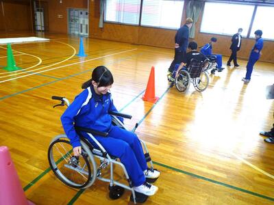 社会福祉協議会のご協力のもと、2年生が車いす体験、高齢者疑似体験をおこないました。車いす体験では、車いすの扱い方をはじめ、実際に乗ってスラロームや段差を乗り越える体験をしました。