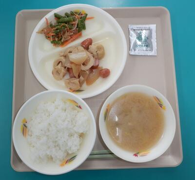 ごはん、ふりかけ、おでん、いんげんのごまあえ、白菜と油揚げのみそ汁