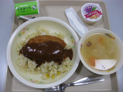 牛乳、エスカロップ風(麦ごはん)、ポトフ、ワインゼリー