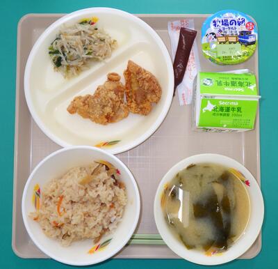 牛乳(ミルメーク)、五目ごはん、鶏のからあげ、ナムル、豆腐とわかめの味噌汁、ヨーグルト